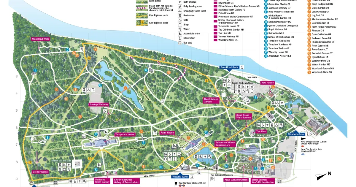 This map prioritises accessibility information and highlights areas of sensory interest. It also includes a zoomed-in map of part of the Gardens, to help you navigate the busiest area.
